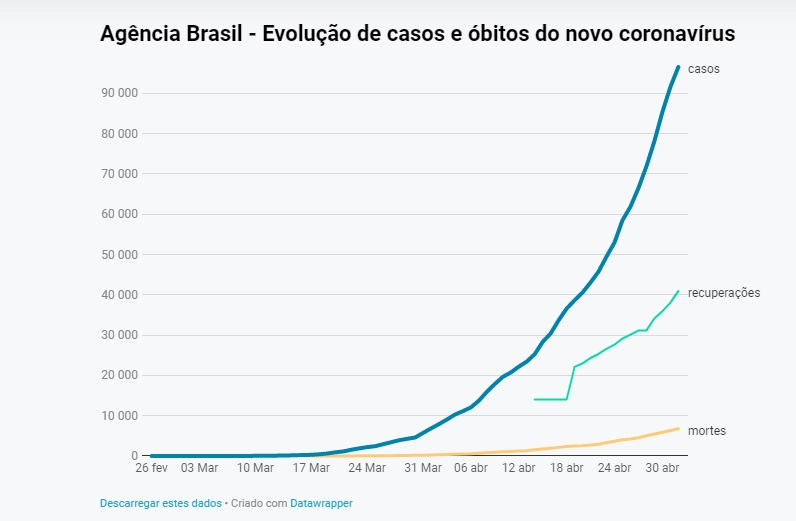 O Ministério da Saúde divulgou neste sábado (2) novos números sobre a pandemia do novo coronavírus (covid-19) no país. De acordo com levantamento diário feito pela pasta, o Brasil tem 96.559 casos confirmados da doença e 6.750 mortes foram registradas. A taxa de letalidade está em 7%. Nas últimas 24 horas, o ministério registrou 4.970 novos casos e 421 mortes.