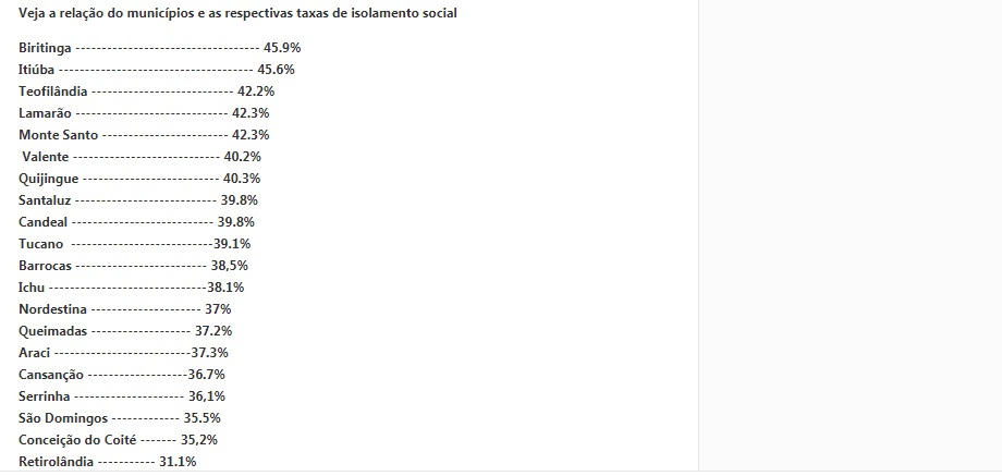 Na ocasião, o Calila Notícias observou que apenas Cansanção no território do sisal estaria cumprindo a recomendação (53,9%). No entanto, no dia seguinte, dia 21 a lista foi atualizada e notamos que Cansanção teve uma queda considerável (36.7%) ficando na 16ª posição.