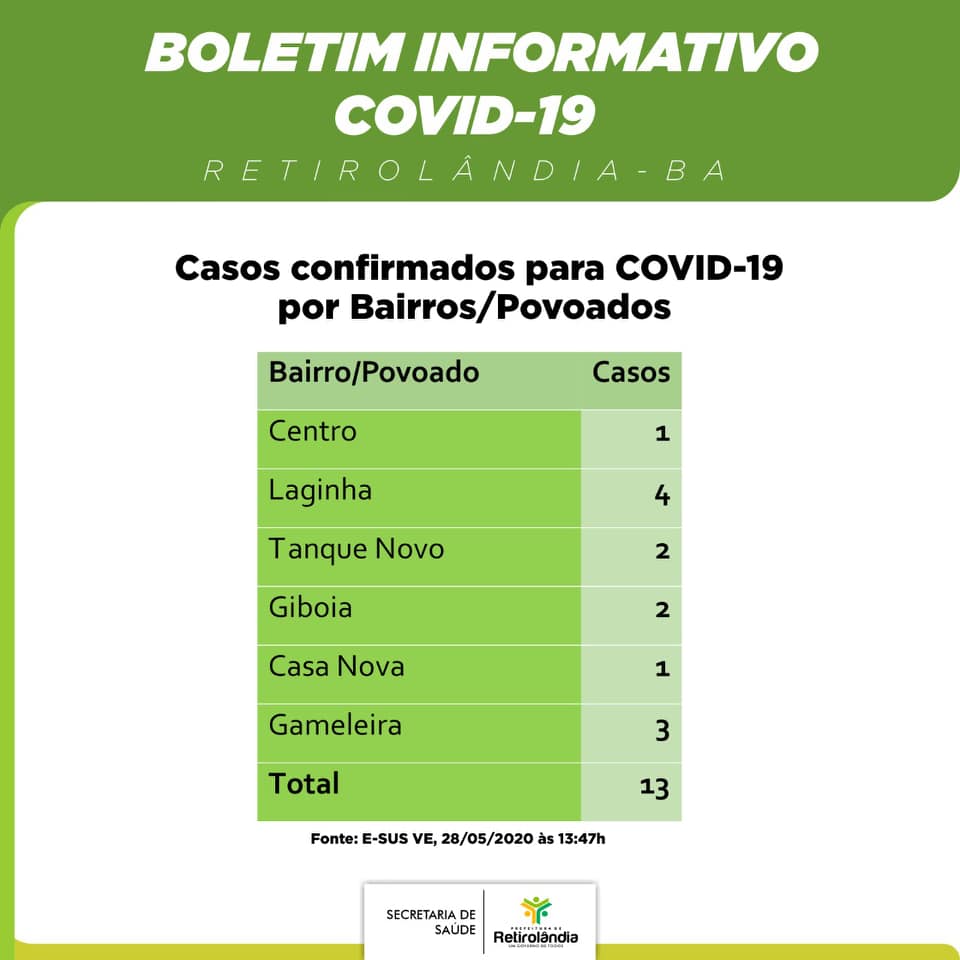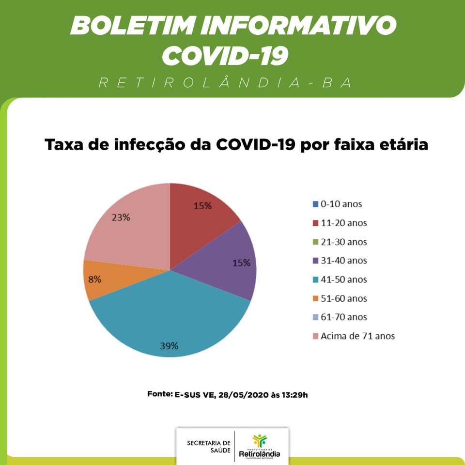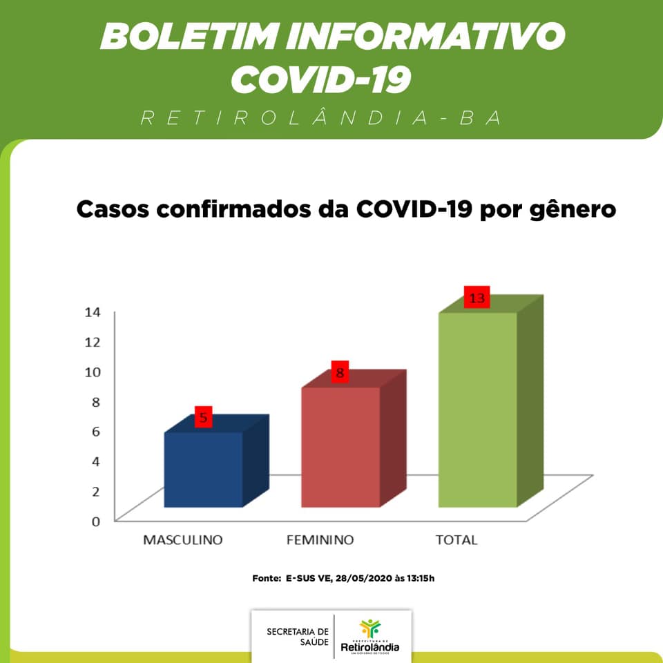 A Secretaria de Saúde junto a Vigilância Epidemiológica de Retirolândia divulgaram na noite de quinta-feira, 28, que a Covid-19 infectou a 13 pessoas e destaca as infecções abrangentes à localidades, gêneros, faixa etária e dentre outros. Os gráficos e tabelas foram elaboradas por Moisés Almeida, enfermeiro sanitarista, coordenador de Atenção Básica do município de Retirolândia.
