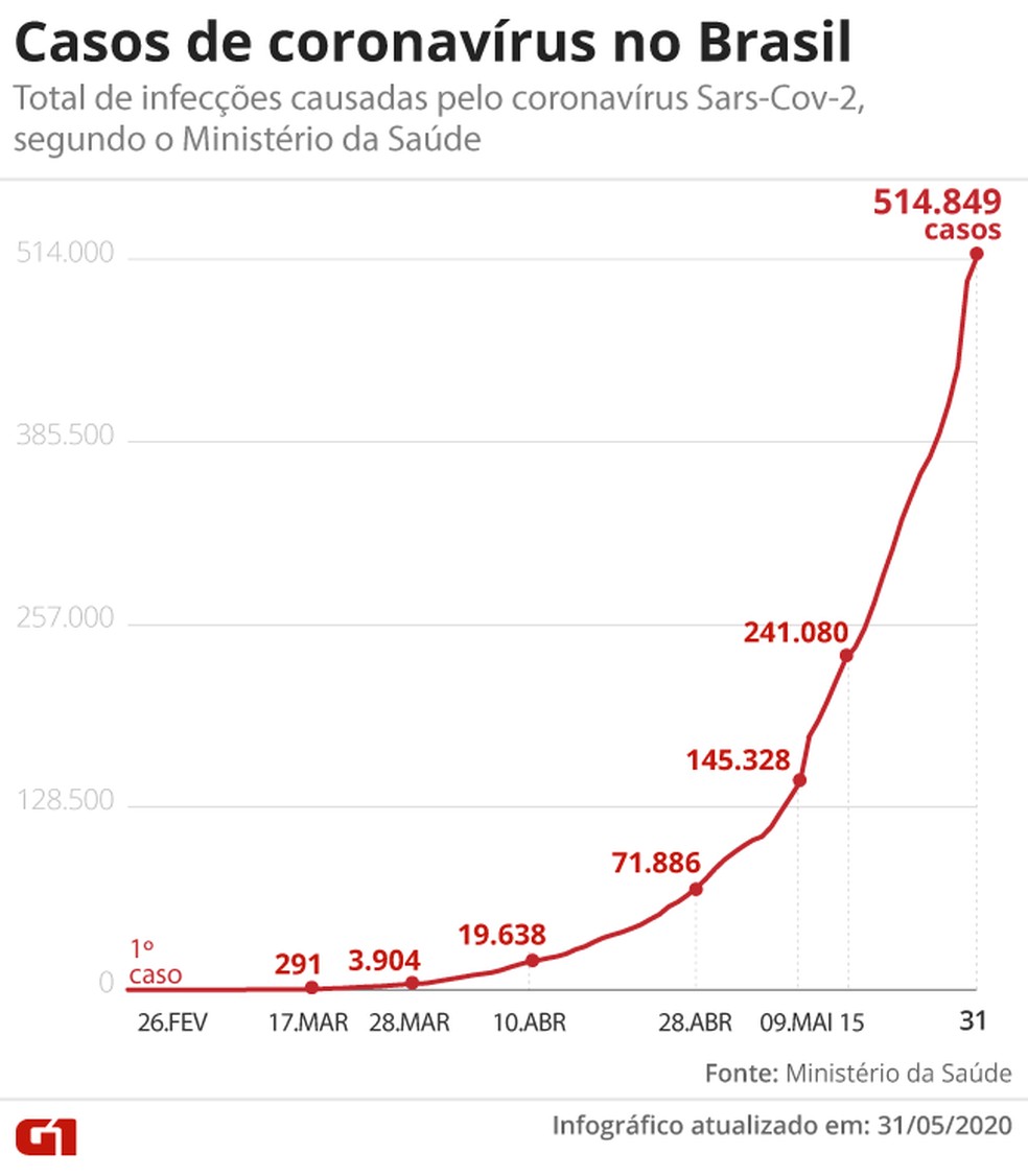 O Brasil ultrapassou neste domingo (31) a marca de 500 mil casos confirmados de infectados por Covid-19. Segundo o mais recente balanço do Ministério da Saúde há no país 514.849 casos.