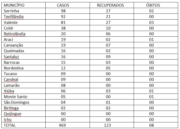 Quijingue e Ichu são os dois que ainda não tiveram registros de Covid-19.