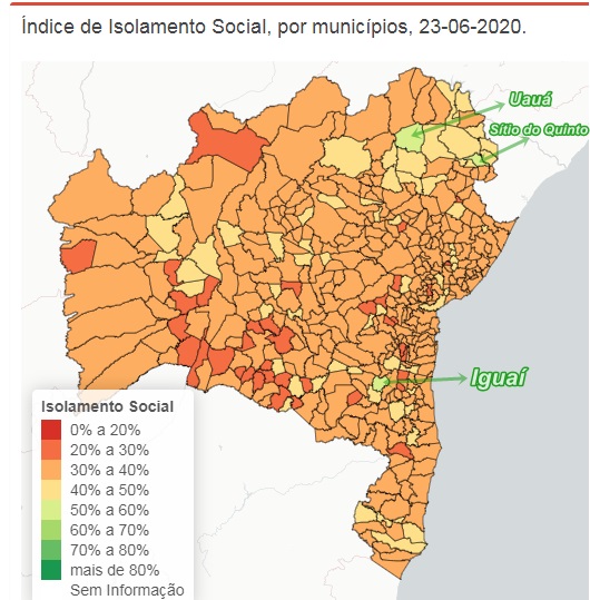 A Plataforma In Loco divulgou nesta quarta-feira, 24, os índices de isolamento social dos 417 municípios do Estado da Bahia, apenas três deles conseguiram taxa razoável na casa dos 50%, o mínimo exigido, já que o ideal segundo os órgãos de saúde é acima de 70%, algo jamais alcançado.