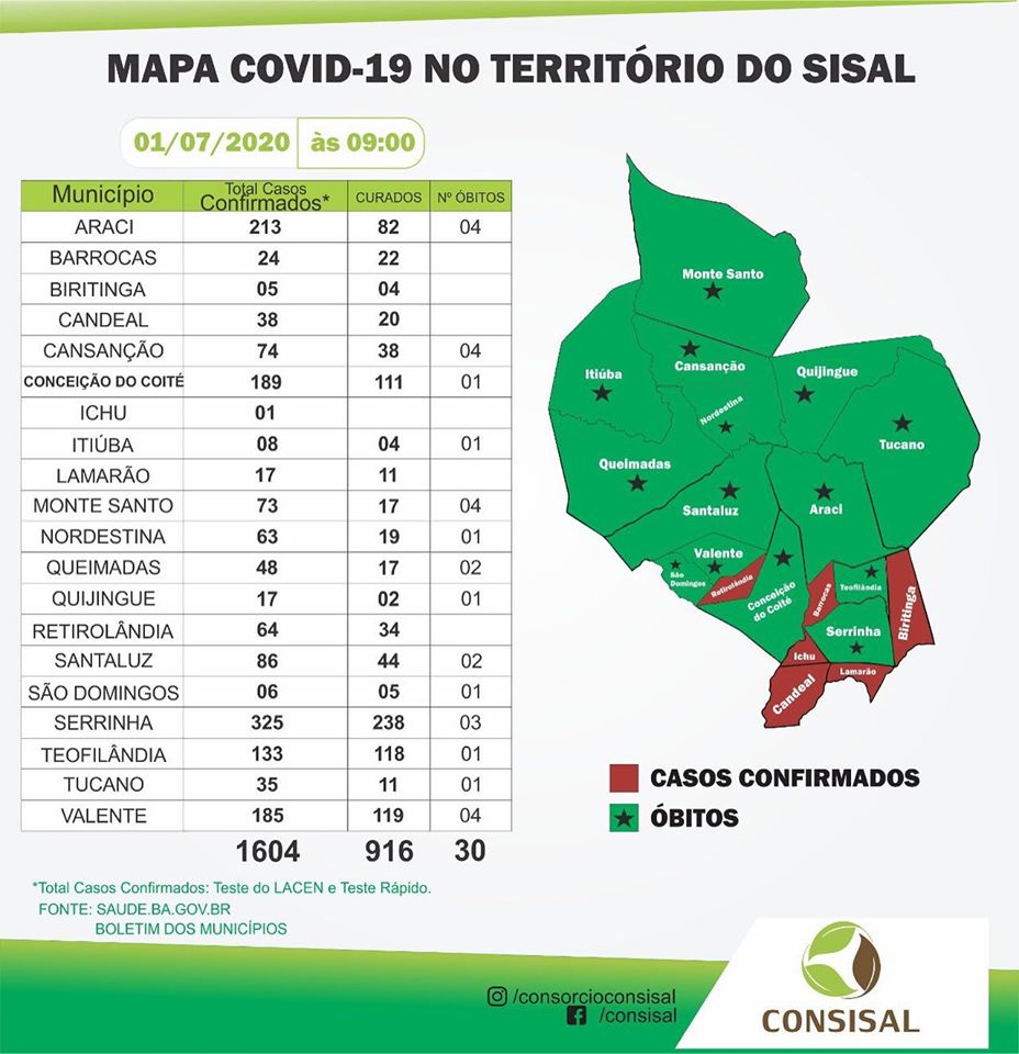No território do sisal composto por 20 municípios, o Calila Notícias fez um levantamento da evolução da pandemia na região e constatou que entre 25 de março quando foi confirmado o primeiro caso na cidade de São Domingos até terça-feira, 30/06, ou seja, 95 dias depois, foram registrados 1.604 casos confirmados, destes, 916 estão recuperados, o vírus está ativo em 886 pessoas e 30 morreram. Ressalta-se que o primeiro óbito foi registrado em Araci em 8 de abril, na ocasião era o 16° caso de morte em consequência do novo Coronavírus em todo estado.