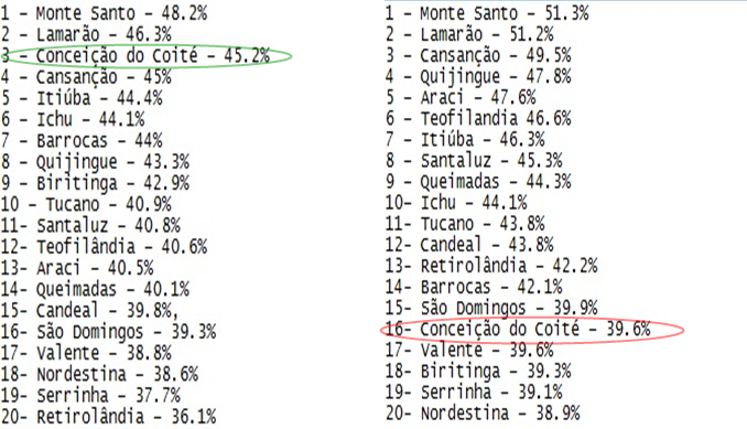 Observando a relação abaixo percebe-se que Monte Santo, Lamarão e Cansanção se mantiveram entre os 3 melhores índices. Esses três municípios sempre aparecem com posição de destaque, diferente de Coité que está sempre na parte de baixo, juntinho a Serrinha que vive situação pior, nunca alcançou 45%.