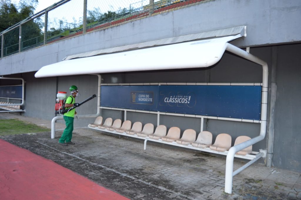 O Estádio de Pituaçu passou por um processo de desinfecção e higienização na tarde desta segunda-feira (20), garantindo ainda mais segurança à saúde dos atletas, dirigentes e profissionais de imprensa que irão, a partir de quarta-feira, 22, utilizar o equipamento com jogos válidos da Copa Nordeste e Campeonato Baiano.