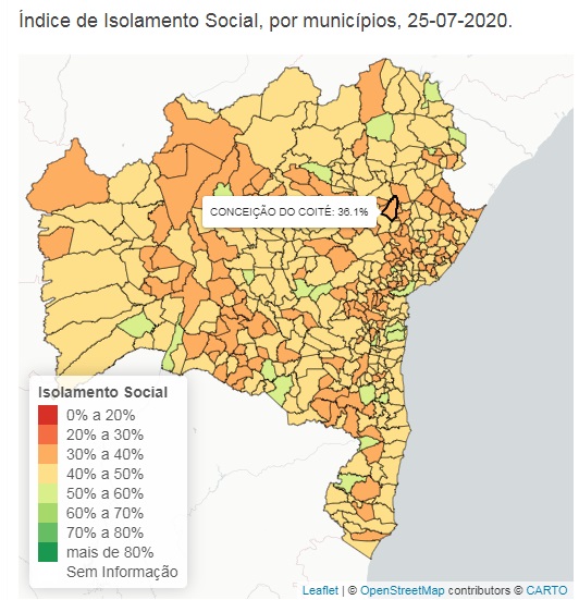 Conforme o mapa abaixo, Coité aparece com índice de isolamento de 36.1% neste domingo, dados referentes a circulação de pessoas no sábado dia 25, o que deixa o município com um dos piores índices. Dos 417 municípios baianos menos de 30 chegaram a casa dos 50%, entre eles está Gavião um dos 10 municípios que continua sem registro de Coronavírus. Gavião obteve 53.6%. Uauá teve o melhor índice no Estado com 58.6%.
