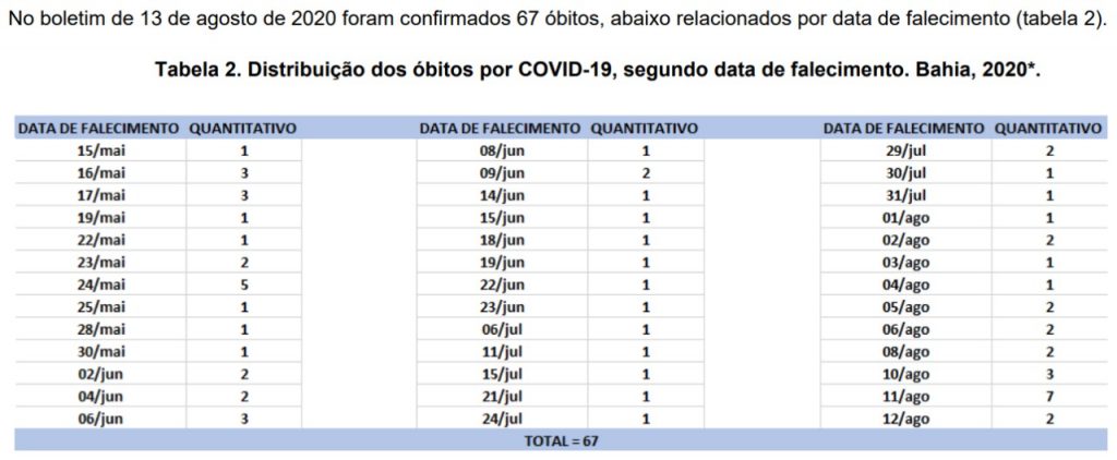 O boletim epidemiológico de hoje contabiliza 67 óbitos que ocorreram em diversas datas, conforme tabela abaixo. A existência de registros tardios e/ou acúmulo de casos deve-se a sobrecarga das equipes de investigação, pois há doenças de notificação compulsória para além da Covid-19. Outro motivo é o aprofundamento das investigações epidemiológicas por parte das vigilâncias municipais e estadual a fim de evitar distorções ou equívocos, como desconsiderar a causa do óbito um traumatismo craniano ou um câncer em estágio terminal, ainda que a pessoa esteja infectada pelo coronavírus.