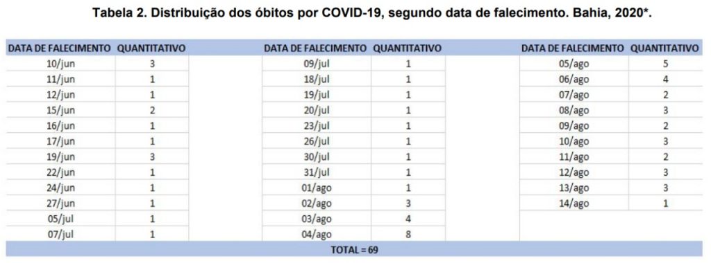 O boletim epidemiológico de hoje contabiliza 69 óbitos que ocorreram em diversas datas, conforme tabela abaixo. A existência de registros tardios e/ou acúmulo de casos deve-se a sobrecarga das equipes de investigação, pois há doenças de notificação compulsória para além da Covid-19. Outro motivo é o aprofundamento das investigações epidemiológicas por parte das vigilâncias municipais e estadual a fim de evitar distorções ou equívocos, como desconsiderar a causa do óbito um traumatismo craniano ou um câncer em estágio terminal, ainda que a pessoa esteja infectada pelo coronavírus.