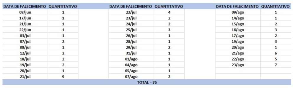 O boletim epidemiológico de hoje contabiliza 76 óbitos que ocorreram em diversas datas, conforme tabela abaixo. A existência de registros tardios e/ou acúmulo de casos deve-se a sobrecarga das equipes de investigação, pois há doenças de notificação compulsória para além da Covid-19. Outro motivo é o aprofundamento das investigações epidemiológicas por parte das vigilâncias municipais e estadual a fim de evitar distorções ou equívocos, como desconsiderar a causa do óbito um traumatismo craniano ou um câncer em estágio terminal, ainda que a pessoa esteja infectada pelo coronavírus.
