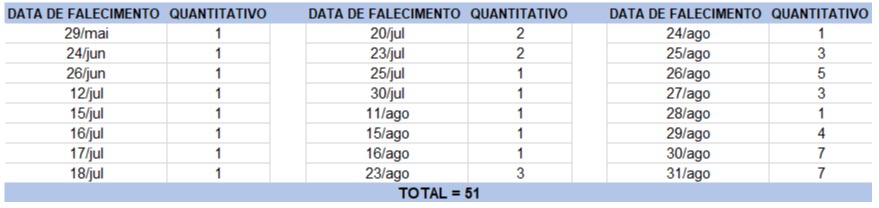 O boletim epidemiológico de hoje contabiliza 51 óbitos que ocorreram em diversas datas, conforme tabela abaixo. A existência de registros tardios e/ou acúmulo de casos deve-se a sobrecarga das equipes de investigação, pois há doenças de notificação compulsória para além da Covid-19. Outro motivo é o aprofundamento das investigações epidemiológicas por parte das vigilâncias municipais e estadual a fim de evitar distorções ou equívocos, como desconsiderar a causa do óbito um traumatismo craniano ou um câncer em estágio terminal, ainda que a pessoa esteja infectada pelo coronavírus.