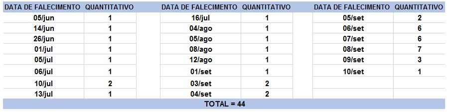 O boletim epidemiológico de hoje contabiliza 44 óbitos que ocorreram em diversas datas, conforme tabela abaixo. A existência de registros tardios e/ou acúmulo de casos deve-se a sobrecarga das equipes de investigação, pois há doenças de notificação compulsória para além da Covid-19. Outro motivo é o aprofundamento das investigações epidemiológicas por parte das vigilâncias municipais e estadual a fim de evitar distorções ou equívocos, como desconsiderar a causa do óbito um traumatismo craniano ou um câncer em estágio terminal, ainda que a pessoa esteja infectada pelo coronavírus.