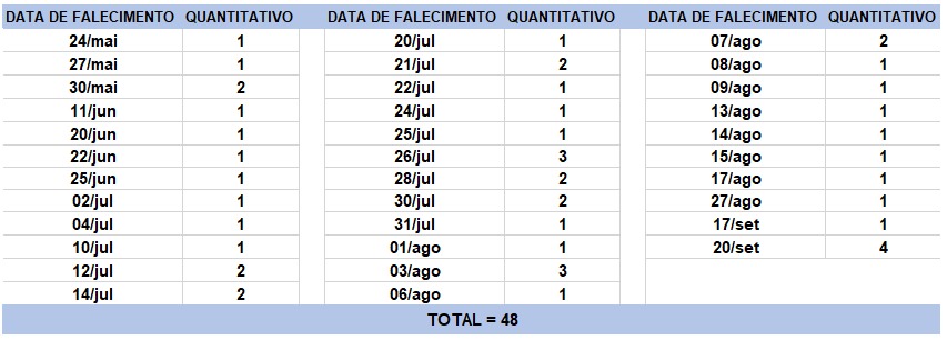 O boletim epidemiológico de hoje contabiliza 48 óbitos que ocorreram em diversas datas, conforme tabela abaixo. A existência de registros tardios e/ou acúmulo de casos deve-se a sobrecarga das equipes de investigação, pois há doenças de notificação compulsória para além da Covid-19. Outro motivo é o aprofundamento das investigações epidemiológicas por parte das vigilâncias municipais e estadual a fim de evitar distorções ou equívocos, como desconsiderar a causa do óbito um traumatismo craniano ou um câncer em estágio terminal, ainda que a pessoa esteja infectada pelo coronavírus.