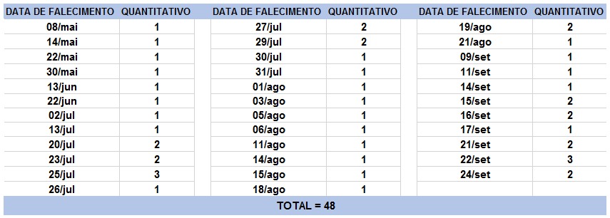 O boletim epidemiológico de hoje contabiliza 48 óbitos que ocorreram em diversas datas, conforme tabela abaixo. A existência de registros tardios e/ou acúmulo de casos deve-se a sobrecarga das equipes de investigação, pois há doenças de notificação compulsória para além da Covid-19. Outro motivo é o aprofundamento das investigações epidemiológicas por parte das vigilâncias municipais e estadual a fim de evitar distorções ou equívocos, como desconsiderar a causa do óbito um traumatismo craniano ou um câncer em estágio terminal, ainda que a pessoa esteja infectada pelo coronavírus.