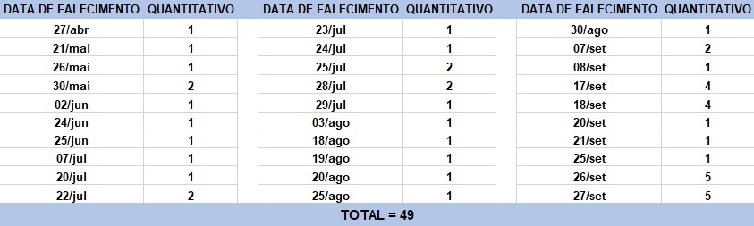 O boletim epidemiológico de hoje contabiliza 49 óbitos que ocorreram em diversas datas, conforme tabela abaixo. A existência de registros tardios e/ou acúmulo de casos deve-se a sobrecarga das equipes de investigação, pois há doenças de notificação compulsória para além da Covid-19. Outro motivo é o aprofundamento das investigações epidemiológicas por parte das vigilâncias municipais e estadual a fim de evitar distorções ou equívocos, como desconsiderar a causa do óbito um traumatismo craniano ou um câncer em estágio terminal, ainda que a pessoa esteja infectada pelo coronavírus.