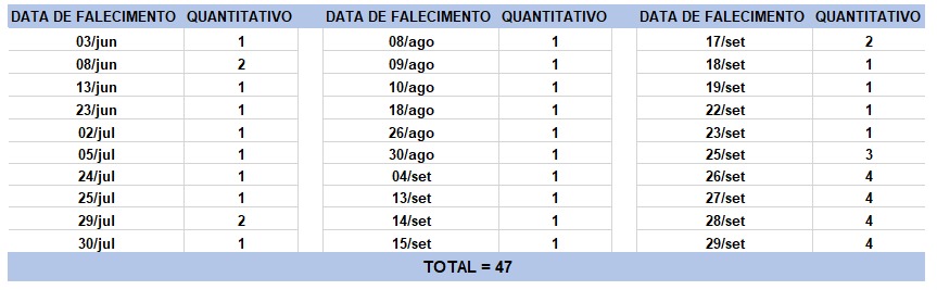 O boletim epidemiológico de hoje contabiliza 47 óbitos que ocorreram em diversas datas, conforme tabela abaixo. A existência de registros tardios e/ou acúmulo de casos deve-se a sobrecarga das equipes de investigação, pois há doenças de notificação compulsória para além da Covid-19. Outro motivo é o aprofundamento das investigações epidemiológicas por parte das vigilâncias municipais e estadual a fim de evitar distorções ou equívocos, como desconsiderar a causa do óbito um traumatismo craniano ou um câncer em estágio terminal, ainda que a pessoa esteja infectada.