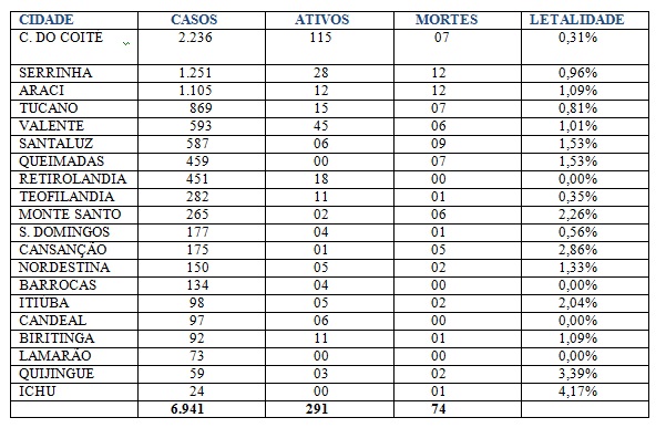 Coité aparece no topo da lista com a maior quantidade de casos e no rodapé está Ichu que registrou apenas 24 casos, no entanto é considerado com a maior taxa de letalidade, uma pessoa morreu o que representa a taxa de 4,17%, maior que a taxa no Brasil com 2,99%, que o Nordeste 2,96% e o Estado da Bahia 2,17%. O grande alento é que no momento Ichu está zerado, ou seja, não tem ninguém com a doença. O mesmo acontece com Lamarão e Queimadas. A segunda maior taxa de letalidade é Quijingue que registrou 59 casos e duas mortes.