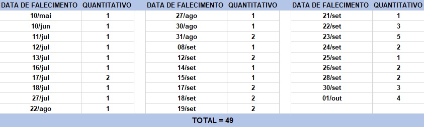 O boletim epidemiológico de hoje contabiliza 49 óbitos que ocorreram em diversas datas, conforme tabela abaixo. A existência de registros tardios e/ou acúmulo de casos deve-se a sobrecarga das equipes de investigação, pois há doenças de notificação compulsória para além da Covid-19. Outro motivo é o aprofundamento das investigações epidemiológicas por parte das vigilâncias municipais e estadual a fim de evitar distorções ou equívocos, como desconsiderar a causa do óbito um traumatismo craniano ou um câncer em estágio terminal, ainda que a pessoa esteja infectada pelo coronavírus.