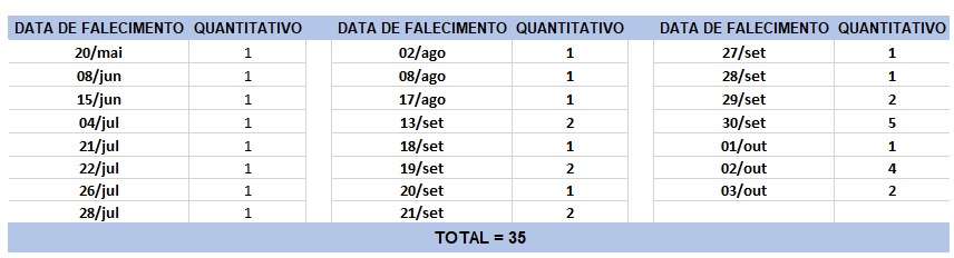 O boletim epidemiológico de hoje contabiliza 35 óbitos que ocorreram em diversas datas, conforme tabela abaixo. A existência de registros tardios e/ou acúmulo de casos deve-se a sobrecarga das equipes de investigação, pois há doenças de notificação compulsória para além da Covid-19. Outro motivo é o aprofundamento das investigações epidemiológicas por parte das vigilâncias municipais e estadual a fim de evitar distorções ou equívocos, como desconsiderar a causa do óbito um traumatismo craniano ou um câncer em estágio terminal, ainda que a pessoa esteja infectada pelo coronavírus.