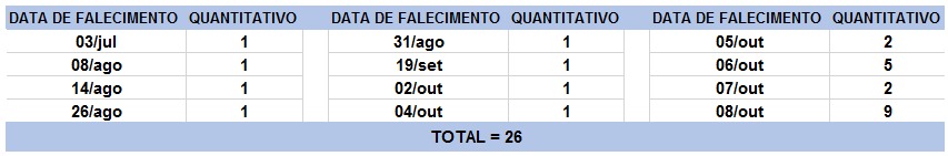O boletim epidemiológico de hoje contabiliza 26 óbitos que ocorreram em diversas datas, conforme tabela abaixo. A existência de registros tardios e/ou acúmulo de casos deve-se a sobrecarga das equipes de investigação, pois há doenças de notificação compulsória para além da Covid-19. Outro motivo é o aprofundamento das investigações epidemiológicas por parte das vigilâncias municipais e estadual a fim de evitar distorções ou equívocos, como desconsiderar a causa do óbito um traumatismo craniano ou um câncer em estágio terminal, ainda que a pessoa esteja infectada pelo coronavírus.