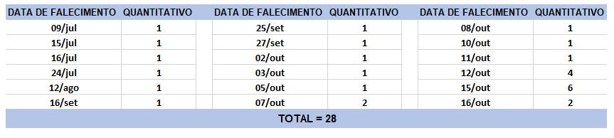 O boletim epidemiológico de hoje contabiliza 28 óbitos que ocorreram em diversas datas, conforme tabela abaixo. A existência de registros tardios e/ou acúmulo de casos deve-se a sobrecarga das equipes de investigação, pois há doenças de notificação compulsória para além da Covid-19. Outro motivo é o aprofundamento das investigações epidemiológicas por parte das vigilâncias municipais e estadual a fim de evitar distorções ou equívocos, como desconsiderar a causa do óbito um traumatismo craniano ou um câncer em estágio terminal, ainda que a pessoa esteja infectada pelo coronavírus.