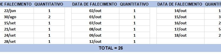 O boletim epidemiológico de hoje contabiliza 26 óbitos que ocorreram em diversas datas, conforme tabela abaixo. A existência de registros tardios e/ou acúmulo de casos deve-se a sobrecarga das equipes de investigação, pois há doenças de notificação compulsória para além da Covid-19. Outro motivo é o aprofundamento das investigações epidemiológicas por parte das vigilâncias municipais e estadual a fim de evitar distorções ou equívocos, como desconsiderar a causa do óbito um traumatismo craniano ou um câncer em estágio terminal, ainda que a pessoa esteja infectada pelo coronavírus.