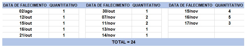 O boletim epidemiológico de hoje contabiliza 24 óbitos que ocorreram em diversas datas, conforme tabela abaixo. A existência de registros tardios e/ou acúmulo de casos deve-se a sobrecarga das equipes de investigação, pois há doenças de notificação compulsória para além da Covid-19. Outro motivo é o aprofundamento das investigações epidemiológicas por parte das vigilâncias municipais e estadual a fim de evitar distorções ou equívocos, como desconsiderar a causa do óbito um traumatismo craniano ou um câncer em estágio terminal, ainda que a pessoa esteja infectada pelo coronavírus.
