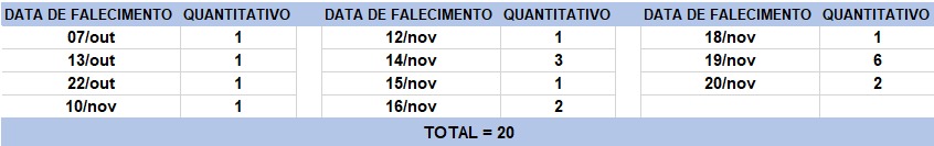 O boletim epidemiológico de hoje contabiliza 20 óbitos que ocorreram em diversas datas, conforme tabela abaixo. A existência de registros tardios e/ou acúmulo de casos deve-se a sobrecarga das equipes de investigação, pois há doenças de notificação compulsória para além da Covid-19. Outro motivo é o aprofundamento das investigações epidemiológicas por parte das vigilâncias municipais e estadual a fim de evitar distorções ou equívocos, como desconsiderar a causa do óbito um traumatismo craniano ou um câncer em estágio terminal, ainda que a pessoa esteja infectada pelo coronavírus.