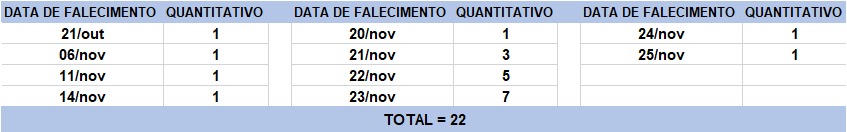 O boletim epidemiológico de hoje contabiliza 22 óbitos que ocorreram em diversas datas, conforme tabela abaixo. A existência de registros tardios e/ou acúmulo de casos deve-se a sobrecarga das equipes de investigação, pois há doenças de notificação compulsória para além da Covid-19. Outro motivo é o aprofundamento das investigações epidemiológicas por parte das vigilâncias municipais e estadual a fim de evitar distorções ou equívocos, como desconsiderar a causa do óbito um traumatismo craniano ou um câncer em estágio terminal, ainda que a pessoa esteja infectada pelo coronavírus.