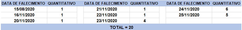 O boletim epidemiológico de hoje contabiliza 20 óbitos que ocorreram em diversas datas, conforme tabela abaixo. A existência de registros tardios e/ou acúmulo de casos deve-se a sobrecarga das equipes de investigação, pois há doenças de notificação compulsória para além da Covid-19. Outro motivo é o aprofundamento das investigações epidemiológicas por parte das vigilâncias municipais e estadual a fim de evitar distorções ou equívocos, como desconsiderar a causa do óbito um traumatismo craniano ou um câncer em estágio terminal, ainda que a pessoa esteja infectada pelo coronavírus.