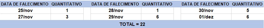 O boletim epidemiológico de hoje contabiliza 22 óbitos que ocorreram em diversas datas, conforme tabela abaixo. A existência de registros tardios e/ou acúmulo de casos deve-se a sobrecarga das equipes de investigação, pois há doenças de notificação compulsória para além da Covid-19. Outro motivo é o aprofundamento das investigações epidemiológicas por parte das vigilâncias municipais e estadual a fim de evitar distorções ou equívocos, como desconsiderar a causa do óbito um traumatismo craniano ou um câncer em estágio terminal, ainda que a pessoa esteja infectada pelo coronavírus.