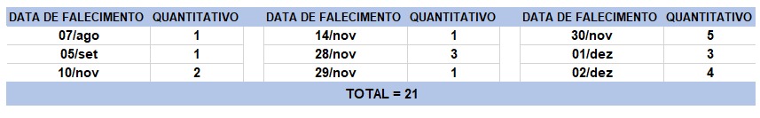 O boletim epidemiológico de hoje contabiliza 21 óbitos que ocorreram em diversas datas, conforme tabela abaixo. A existência de registros tardios e/ou acúmulo de casos deve-se a sobrecarga das equipes de investigação, pois há doenças de notificação compulsória para além da Covid-19. Outro motivo é o aprofundamento das investigações epidemiológicas por parte das vigilâncias municipais e estadual a fim de evitar distorções ou equívocos, como desconsiderar a causa do óbito um traumatismo craniano ou um câncer em estágio terminal, ainda que a pessoa esteja infectada pelo coronavírus.