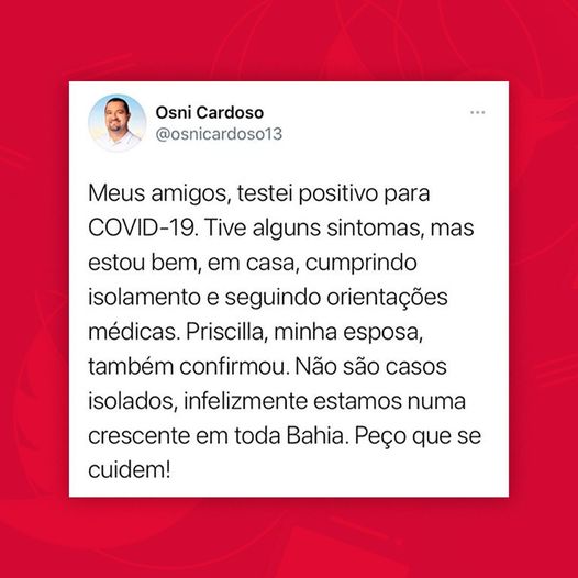 O deputado estadual Osni Cardoso (PT) ele que disputou as eleições ao cargo de prefeito de Serrinha e ficou em segundo lugar no dia 15 de novembro anunciou em sua rede social que testou positivo para à Covid-19.
