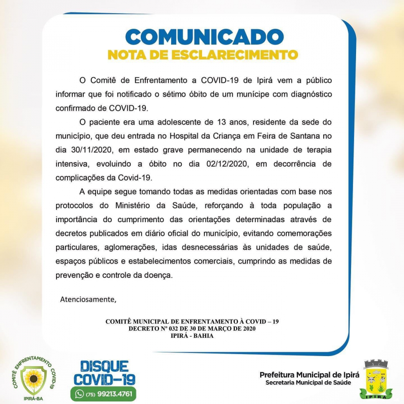 Segundo o Ipirá Notícias, em nota divulgada nas redes sociais, a pasta informa que a jovem residia na sede do município, deu entrada no Hospital da Criança em Feira de Santana, no dia 30/11, em estado grave, permanecendo na unidade de terapia intensiva, involuindo a óbito do dia 02/12.