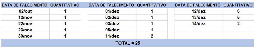 O boletim epidemiológico de hoje contabiliza 25 óbitos que ocorreram em diversas datas, conforme tabela abaixo. A existência de registros tardios e/ou acúmulo de casos deve-se a sobrecarga das equipes de investigação, pois há doenças de notificação compulsória para além da Covid-19. Outro motivo é o aprofundamento das investigações epidemiológicas por parte das vigilâncias municipais e estadual a fim de evitar distorções ou equívocos, como desconsiderar a causa do óbito um traumatismo craniano ou um câncer em estágio terminal, ainda que a pessoa esteja infectada pelo coronavírus.