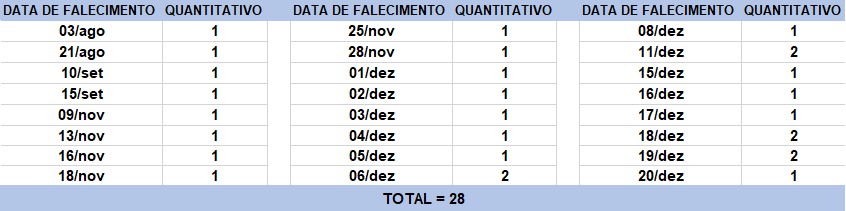 O boletim epidemiológico de hoje contabiliza 28 óbitos que ocorreram em diversas datas, conforme tabela abaixo. A existência de registros tardios e/ou acúmulo de casos deve-se a sobrecarga das equipes de investigação, pois há doenças de notificação compulsória para além da Covid-19. Outro motivo é o aprofundamento das investigações epidemiológicas por parte das vigilâncias municipais e estadual a fim de evitar distorções ou equívocos, como desconsiderar a causa do óbito um traumatismo craniano ou um câncer em estágio terminal, ainda que a pessoa esteja infectada pelo coronavírus.
