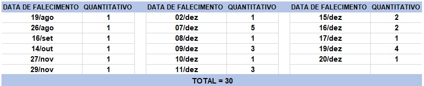 O boletim epidemiológico de hoje contabiliza 30 óbitos que ocorreram em diversas datas, conforme tabela abaixo. A existência de registros tardios e/ou acúmulo de casos deve-se a sobrecarga das equipes de investigação, pois há doenças de notificação compulsória para além da Covid-19. Outro motivo é o aprofundamento das investigações epidemiológicas por parte das vigilâncias municipais e estadual a fim de evitar distorções ou equívocos, como desconsiderar a causa do óbito um traumatismo craniano ou um câncer em estágio terminal, ainda que a pessoa esteja infectada pelo coronavírus.