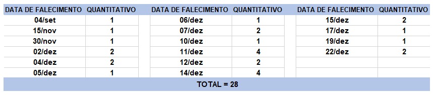 O boletim epidemiológico de hoje contabiliza 28 óbitos que ocorreram em diversas datas, conforme tabela abaixo. A existência de registros tardios e/ou acúmulo de casos deve-se a sobrecarga das equipes de investigação, pois há doenças de notificação compulsória para além da Covid-19. Outro motivo é o aprofundamento das investigações epidemiológicas por parte das vigilâncias municipais e estadual a fim de evitar distorções ou equívocos, como desconsiderar a causa do óbito um traumatismo craniano ou um câncer em estágio terminal, ainda que a pessoa esteja infectada pelo coronavírus.