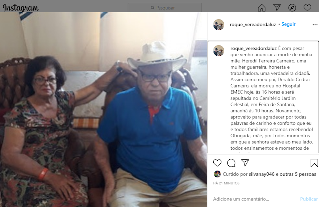 O anuncio da morte de Dona Heredil foi feito pelo filho vereador do município, Roque da Luz em seu perfil do Instagran