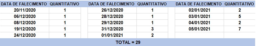 O boletim epidemiológico de hoje contabiliza 29 óbitos que ocorreram em diversas datas, conforme tabela abaixo.