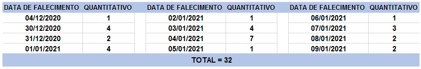O boletim epidemiológico de hoje contabiliza 32 óbitos que ocorreram em diversas datas, conforme tabela abaixo.