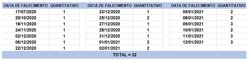O boletim epidemiológico de hoje contabiliza 32 óbitos que ocorreram em diversas datas, conforme tabela abaixo.
