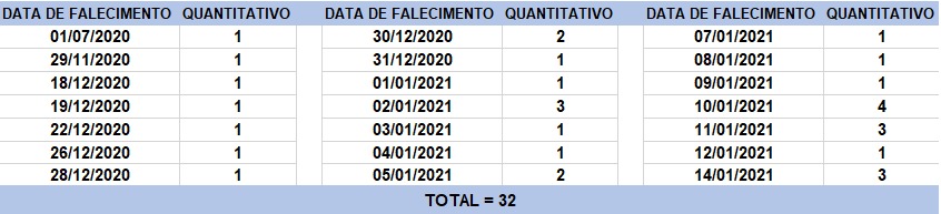 O boletim epidemiológico de hoje contabiliza 32 óbitos que ocorreram em diversas datas, conforme tabela abaixo.