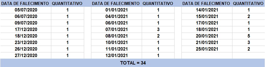 O boletim epidemiológico de hoje contabiliza 34 óbitos que ocorreram em diversas datas, conforme tabela abaixo.