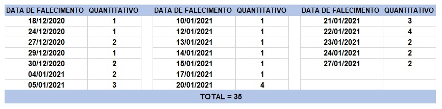 O boletim epidemiológico de hoje contabiliza 35 óbitos que ocorreram em diversas datas, conforme tabela abaixo.