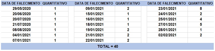 O boletim epidemiológico de hoje contabiliza 40 óbitos que ocorreram em diversas datas, conforme tabela abaixo.