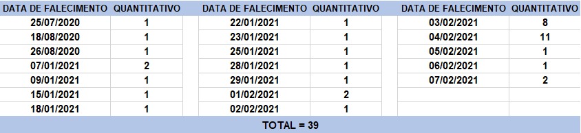 O boletim epidemiológico de hoje contabiliza 39 óbitos que ocorreram em diversas datas, conforme tabela abaixo.