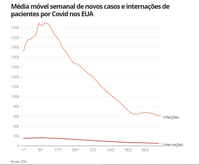 O órgão de saúde americano afirma também que a média semanal de internações de pacientes com coronavírus teve queda de 67%: de 16.540 (9 de janeiro) para 5.490 (2 de março).