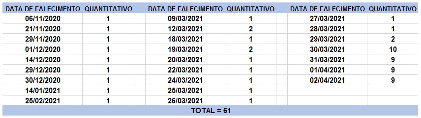 Com o retorno do funcionamento dos serviços referidos é possível verificar um aumento significativo de novos óbitos, que não necessariamente ocorreram na data divulgada, ou seja, podem ter ocorrido em dias anteriores.