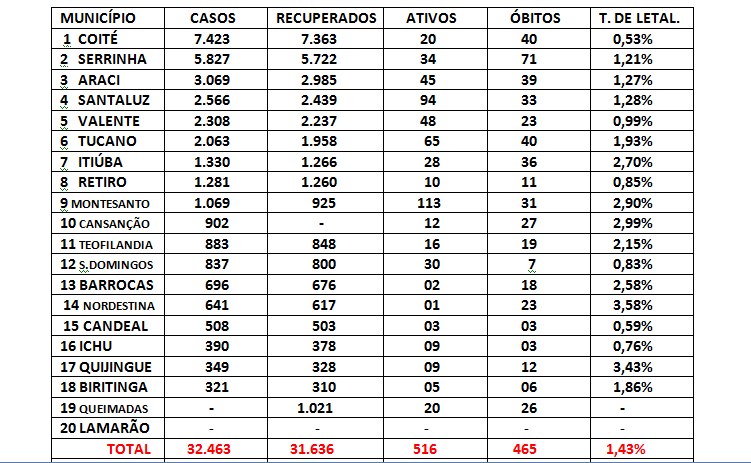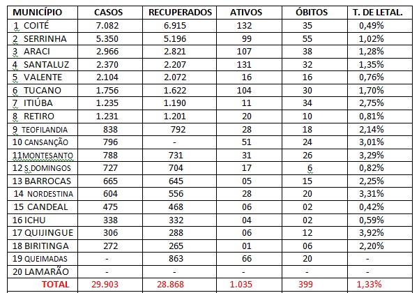 Na tabela abaixo veja os números de todos os municípios, vale ressaltar que alguns deles não estavam se atualização ha alguns dias. Cansanção a última atualização foi dia 04/05; Quijingue, São Domingos e Teofilândia 07/05; Queimadas, Barrocas e Candeal 08/05. Os demais são atualizações dos dias 09 e 10/05.