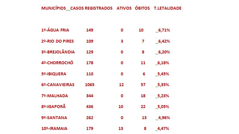 O Calila Notícias realizou um levantamento através dos números da Covid-19 nos 417 municípios no site da Infovis, vinculado a Superintendência de Estudos Econômicos da Bahia (SEI) em parceria com a Secretaria de Saúde do Estado (SESAB) com objetivo de informar a situação dos dez municípios com maiores taxas de letalidade e 10 com as menores taxas. Os números correspondem a última atualização as 23h59 de sexta-feira, 14.